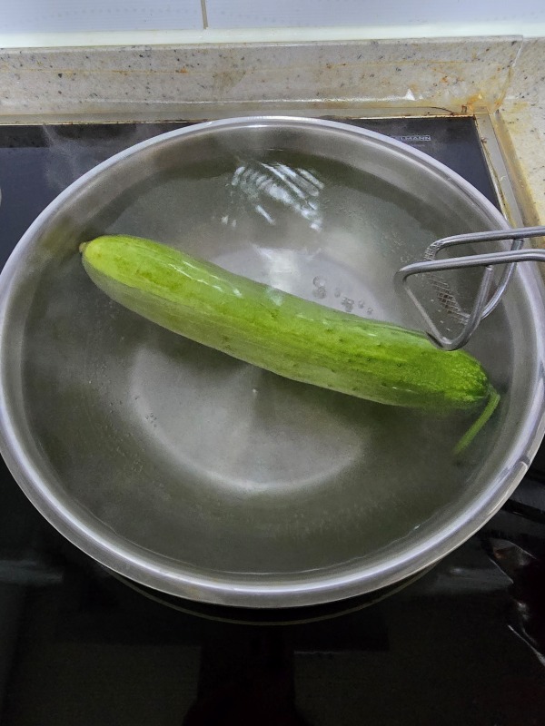 - 끓인 물을 오이 위에 부어주세요. 유리용기나 스테인리스용기는 뜨거운 채로 붓기 가능. 플라스틱 용기라면 식혀서 부어주세요.