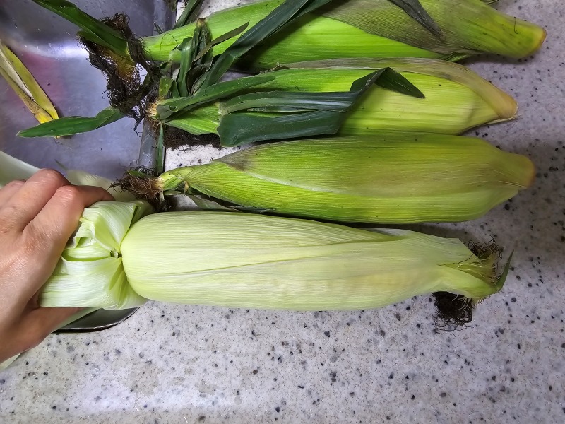 옥수수의 껍질을 벗기고, 옥수수 수염을 당겨서 제거해 주세요.